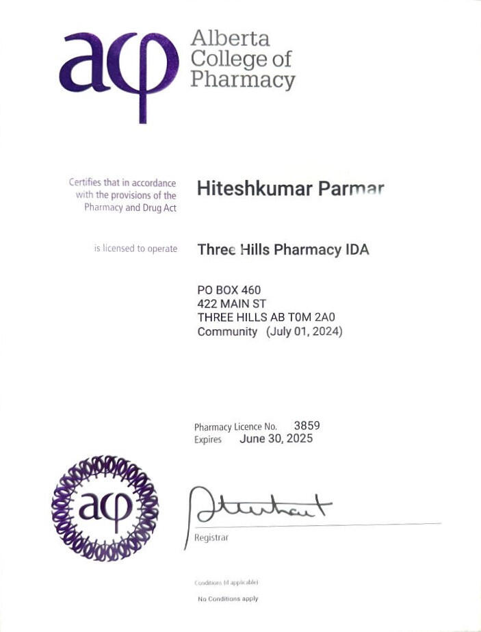 Hitesh lives in town with his wife and their three kids. He enjoys walking with his dogs and playing tennis. He earned his Bachelor’s degree in Pharmacy in India and received his Canadian license in Toronto in 2015. He's been living in Alberta since 2016 and loves rural life.